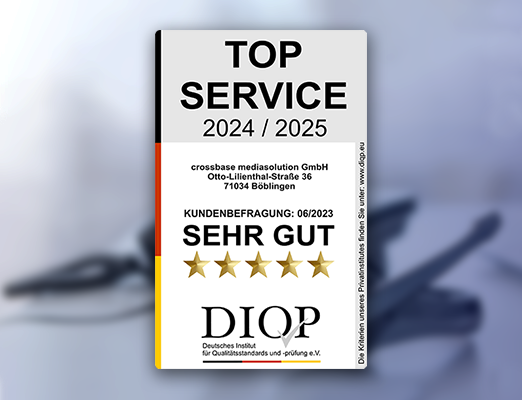crossbase überzeugt mit ausgezeichnetem Kundenservice in Sachen Erreichbarkeit, Freundlichkeit, Reaktionszeit und dem Umgang mit Kundenfeedback. Dafür gab es die Auszeichnung „Top Service“ mit der Note „sehr gut“ des Deutschen Instituts für Qualitätsstandards und -prüfung (DIQP).