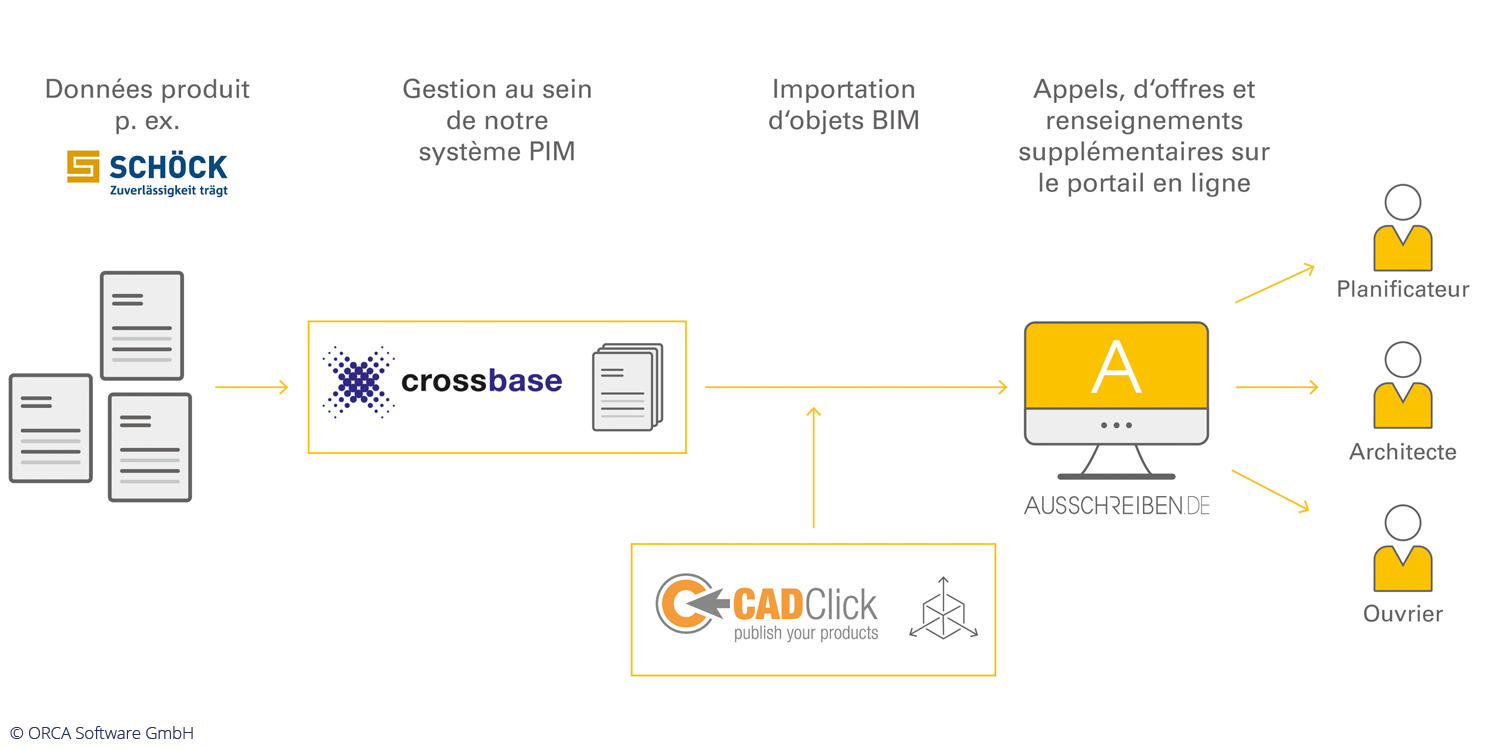 L'interaction entre tous les partenaires impliqués s'explique simplement : Schöck fournit via crossbase les produits à publier, notamment les hiérarchisations de produits, les données techniques, les images de produits, les documents et les textes pour appels d'offres. 4PACE fournit les données CAO/BIM qui peuvent être intégrées dans tous les systèmes CAO/BIM courants. AUSSCHREIBEN.DE présente ces informations de produits et ces données CAO/BIM sur sa plateforme pour les planificateurs et les architectes – le tout intégré sur une seule interface.